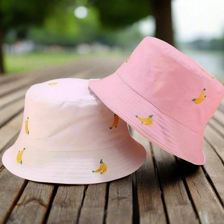 Brighten up your day with this reversible bucket hat featuring charming embroidered bananas. You can flip it to switch between two sweet colors—pink and white. Whether you're soaking up the sun or strolling through the city, this hat offers both style and comfort.