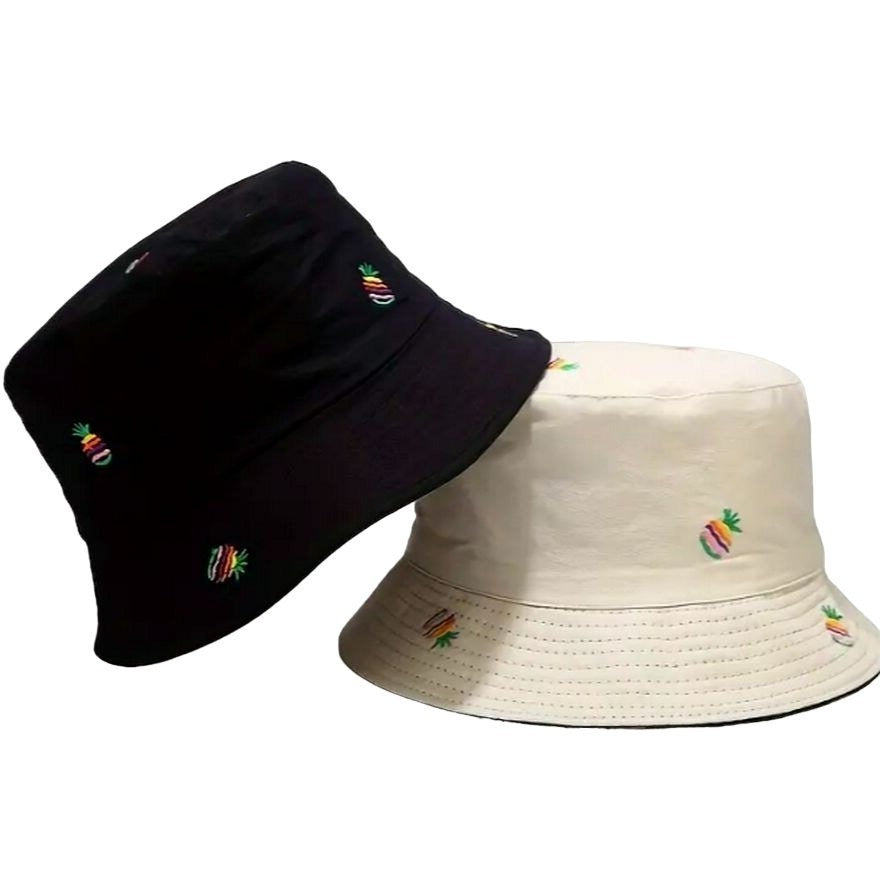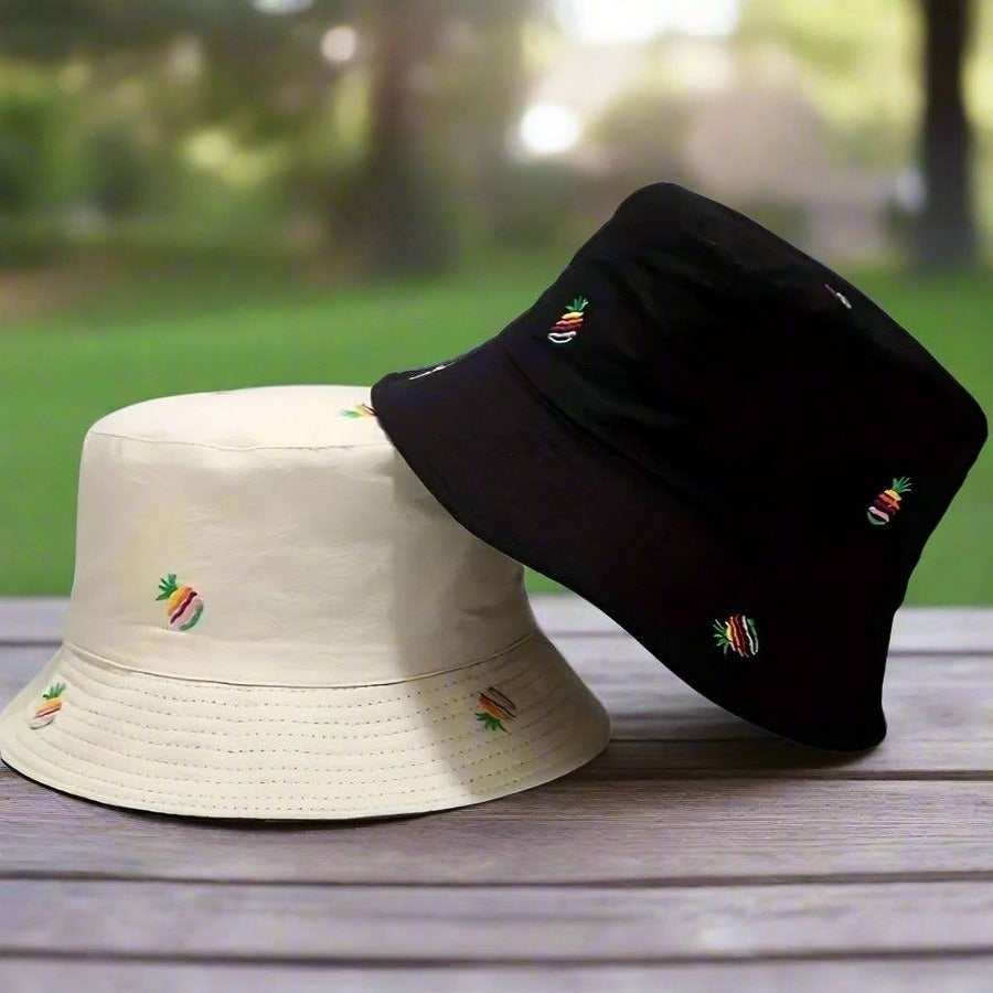 Brighten up your day with this reversible bucket hat featuring charming embroidered pineapples. You can flip it to switch between two classic colors—khaki and black. Whether you're soaking up the sun or strolling through the city, this hat offers both style and comfort.