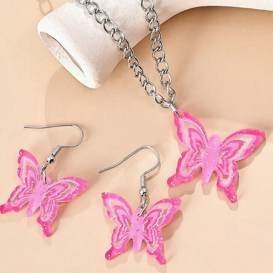 Experience playful charm and blissful punches of color with this acrylic butterfly jewelry set, featuring glitter accents, sure to make any day super fun and more joyful!