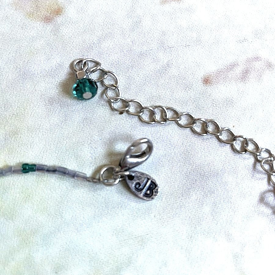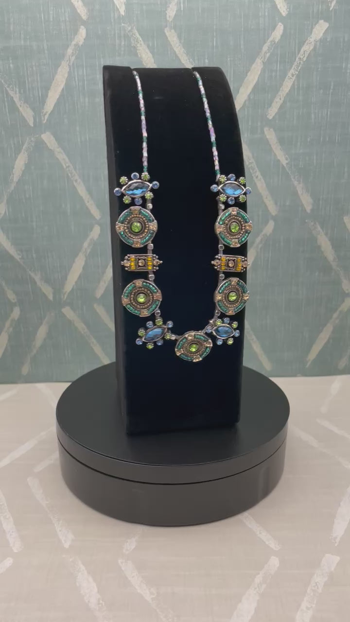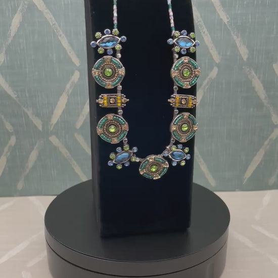 In green, blue, and gold tones, this necklace features a distinctive set of multi-beaded medallions as well as other shapes, creating a truly engaging piece. It appears handmade. However, there is a tag with the initials JB at closure.