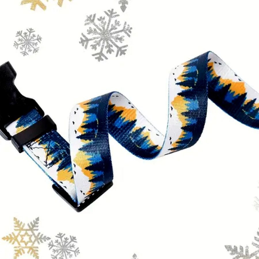 With a charming mountain and tree pattern complete with birds in the sky amid a soothing blue and yellow color palette, this dog collar will add joy and serenity to any day.